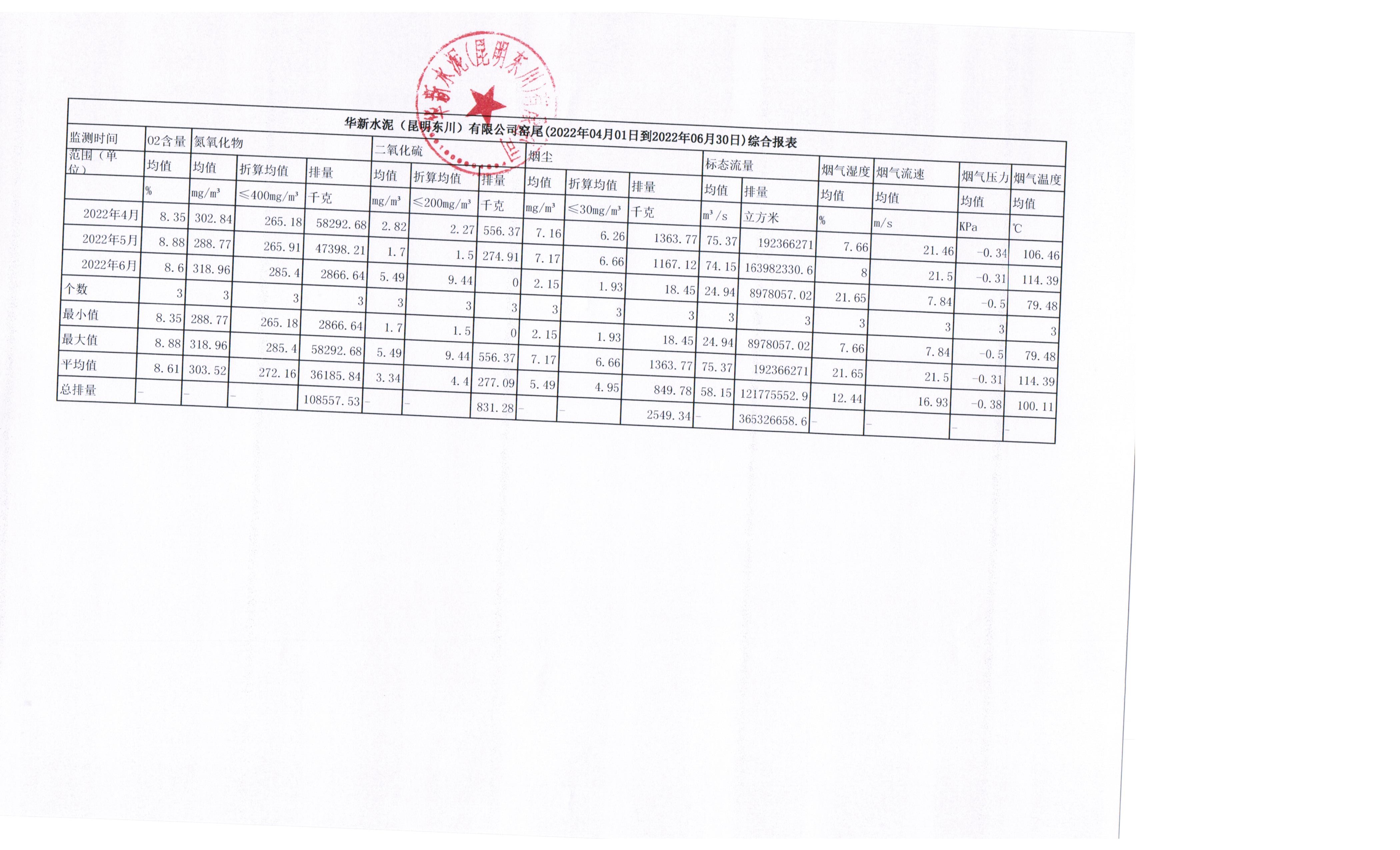 3、華新水泥(昆明東川)有限公司2022年第二季度窯頭煙氣在線監(jiān)測月平均值季報表