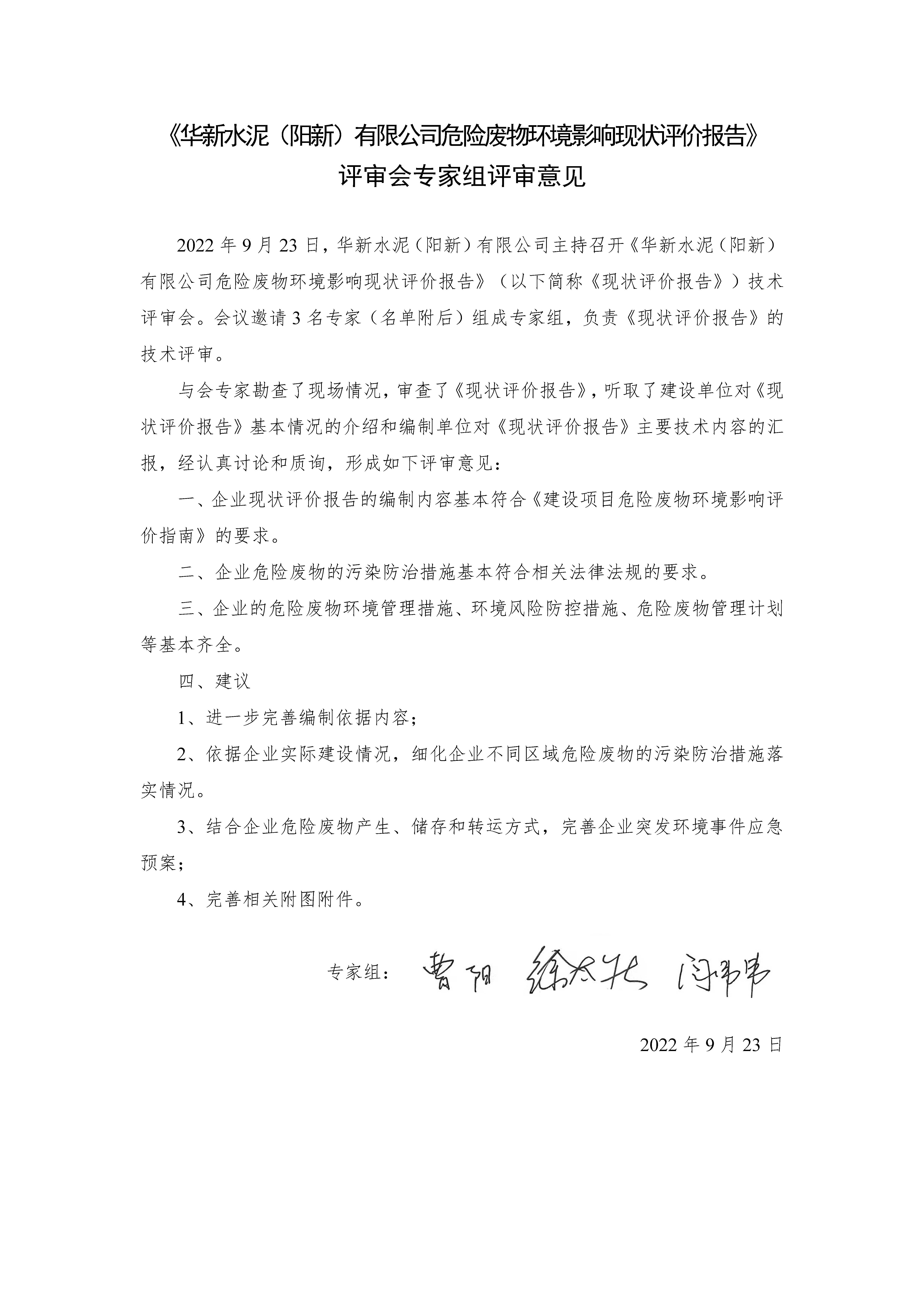 附件3:華新水泥(陽(yáng)新)有限公司危險(xiǎn)廢物環(huán)境影響現(xiàn)狀評(píng)價(jià)專家意見(jiàn)